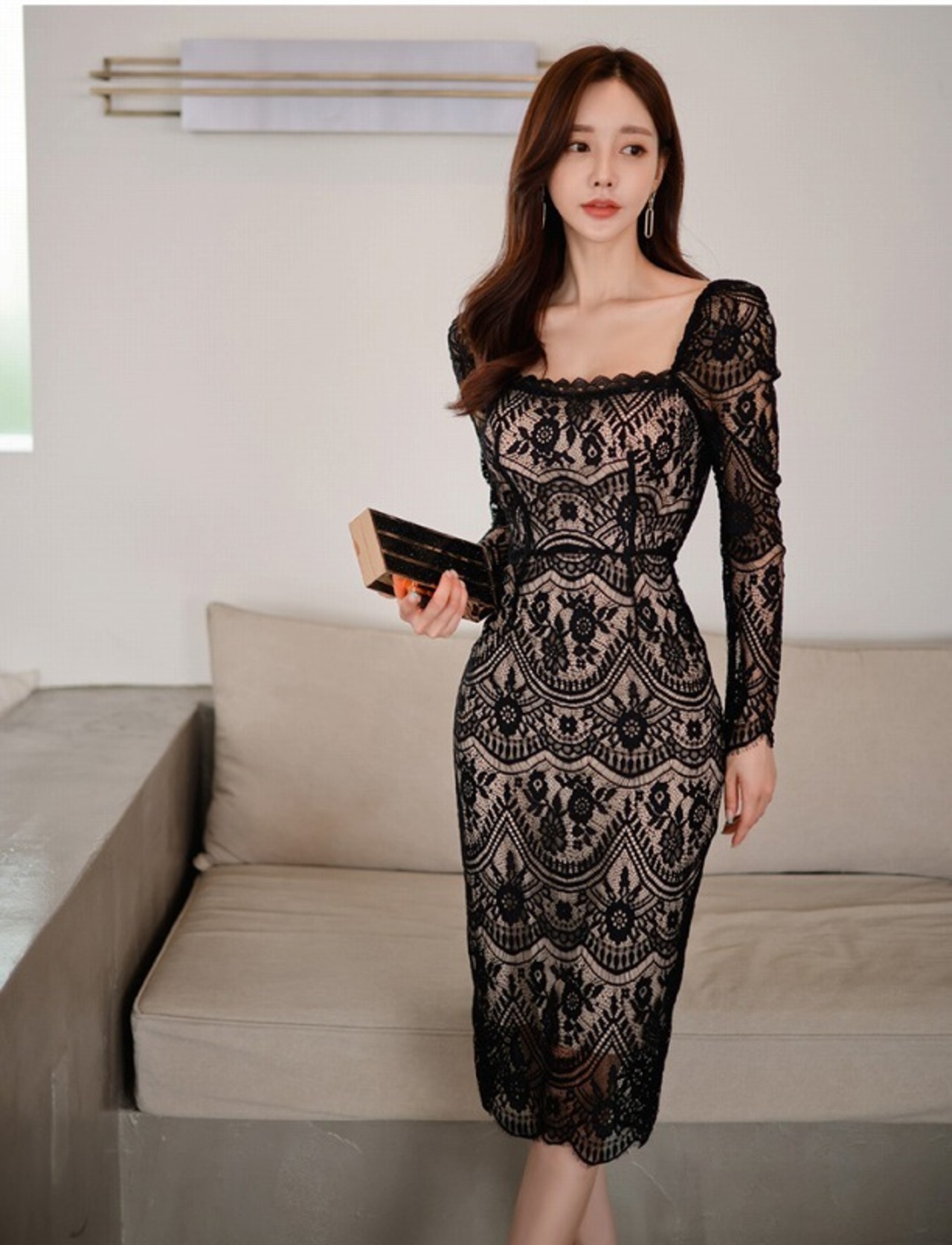 medium | ドレスワンピ 総レース 長袖 スクエアネック ミモレ丈 デート服 女子会 ワンピース スリム