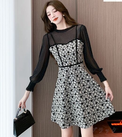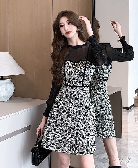 シースルー素材とラメが施されたトップ部分が、女性らしさを際立たせます。フレアデザインが、体型をカバーしながらも、フラワーモチーフで華やかな印象を与えるワンピースです。